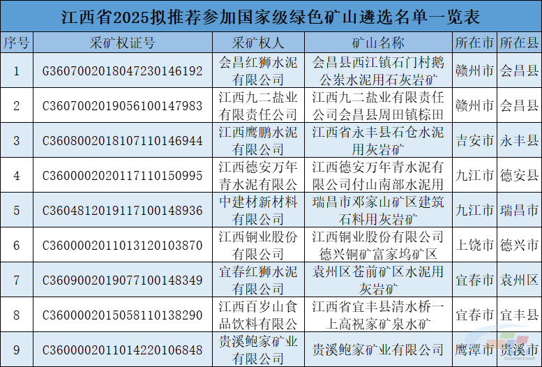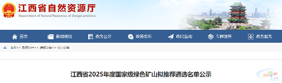9月25日,江西省自然资源厅发布江西省2025年度国家级绿色矿山拟推荐遴选名单公示。