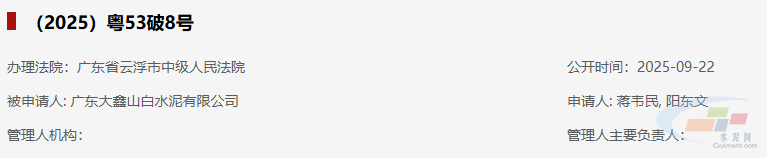 据全国企业破产重整案件信息网公开信息显示,广东大鑫山白水泥有限公司已被蒋韦民、阳东文向广东省云浮市中级人民法院申请破产,公开时间为9月22日,案号为(2025)粤53破8号。