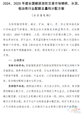 《2024、2025年度全国碳排放权交易市场钢铁、水泥、铝冶炼行业配额总量和分配方案(征求意见稿)》发布