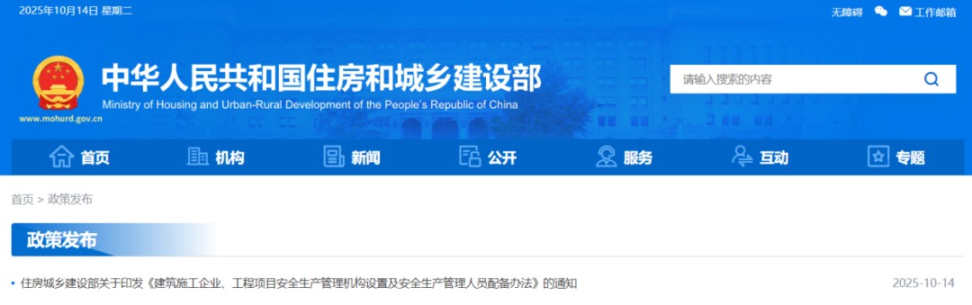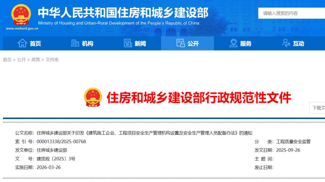 住建部发布《建筑施工企业、工程项目安全生产管理机构设置及安全生产管理人员配备办法》(建质规〔2025〕3号),重点如下:
