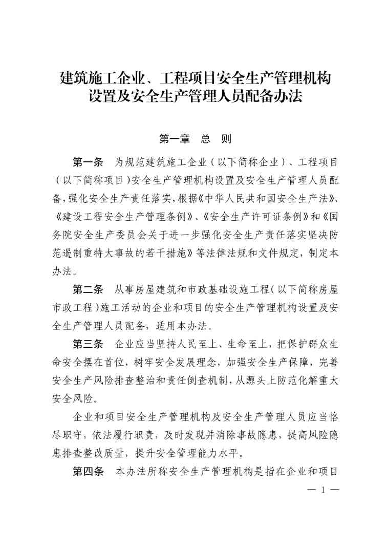 住房城乡建设部关于印发《建筑施工企业、工程项目安全生产管理机构设置及安全生产管理人员配备办法》的通知