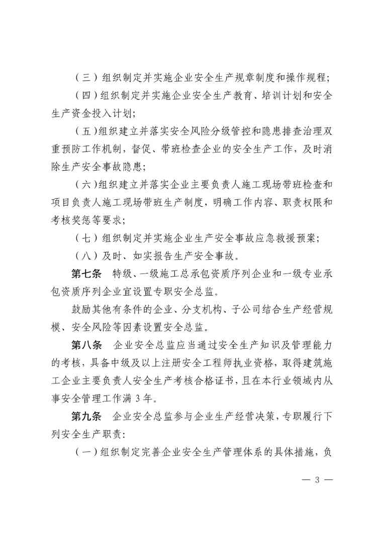 第八条 企业安全总监应当通过安全生产知识及管理能力的考核,具备中级及以上注册安全工程师执业资格,取得建筑施工企业主要负责人安全生产考核合格证书,且在本行业领域内从 事安全管理工作满 3 年。