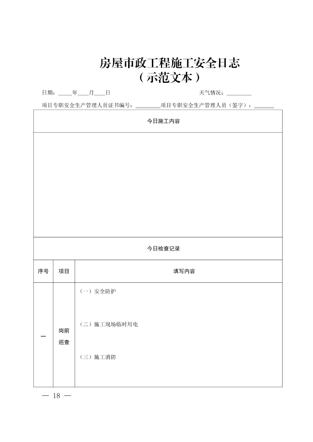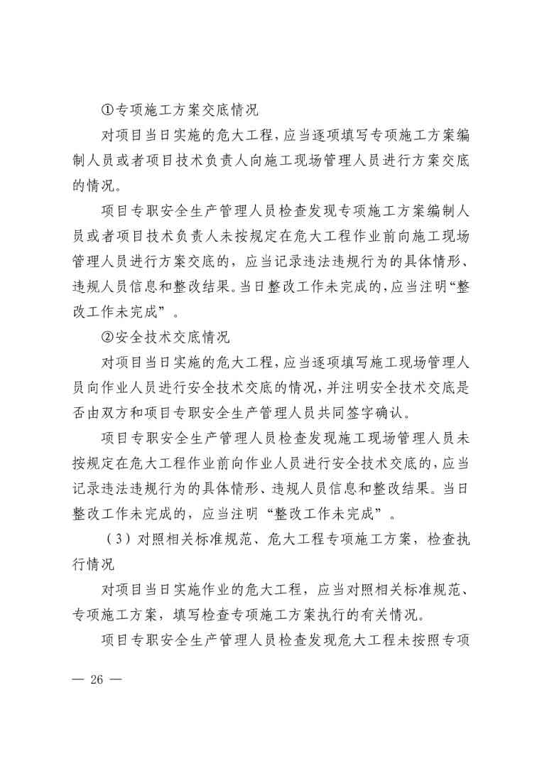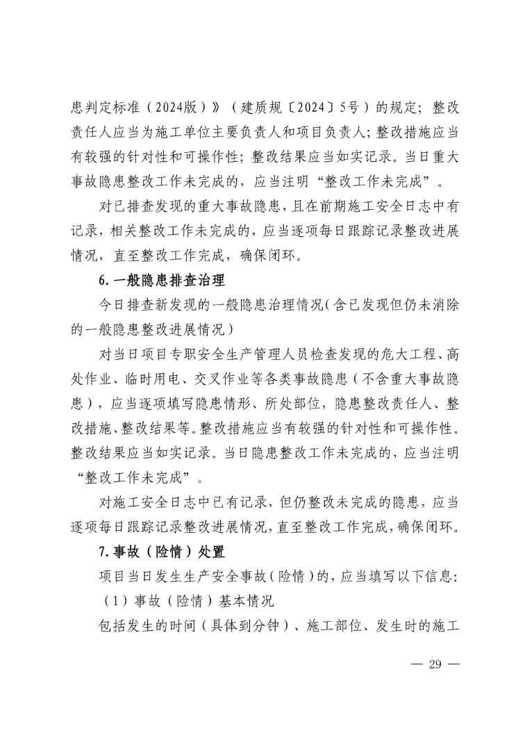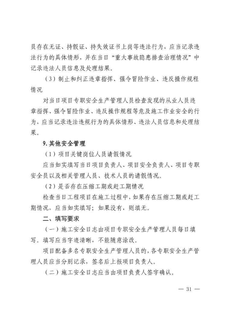 第三十四条 项目专职安全生产管理人员应当将每日安全检查和事故隐患处理情况及时填入施工安全日志(示范文本见附 件)。