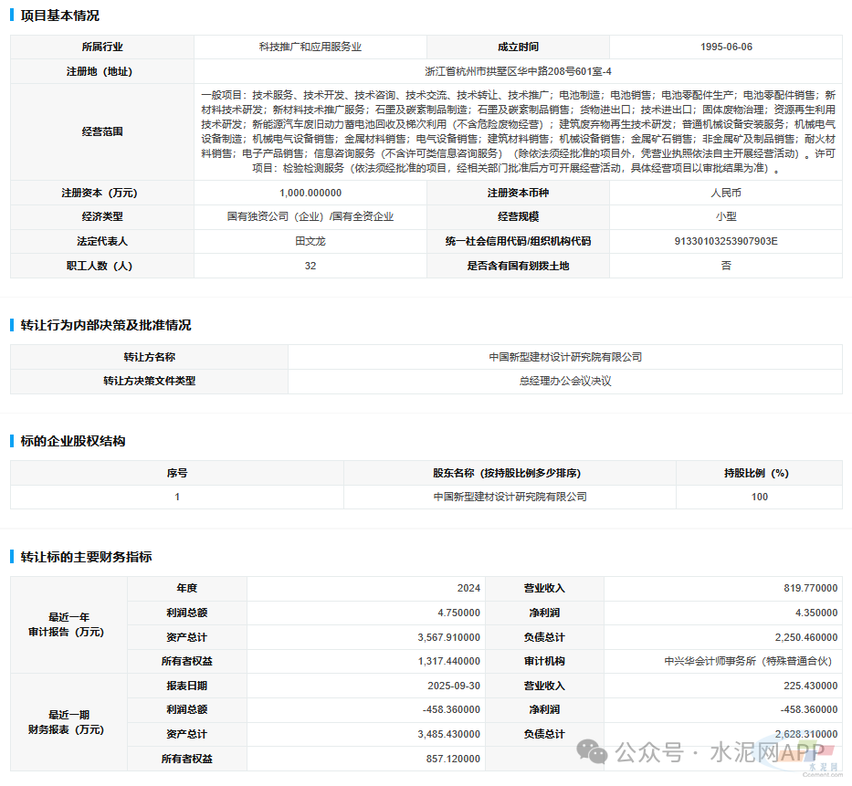 据某产权交易平台显示,10月16日,中建材(浙江)材料科技有限公司100%股权预挂牌进行转让。转让方为中国新型建材设计研究院有限公司,隶属于中国建材集团。