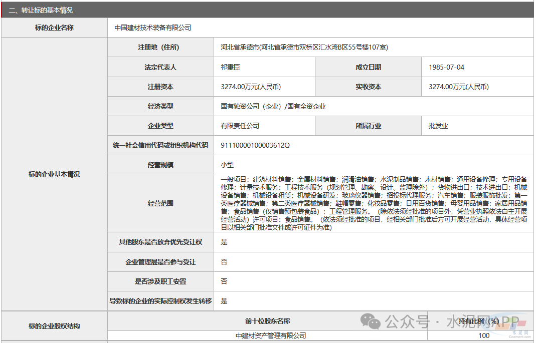 与此同时,中国建材技术装备有限公司100%股权转让信息也与近日发布,转让底价为367.29万元。该企业成立于1985年,注册资本3274万元,所属行业为批发业,为中国建材集团旗下中建材资产管理有限公司全资子公司。
