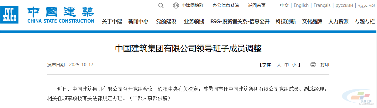 中国建筑集团官网10月17日信息显示,近日,中国建筑集团有限公司召开党组会议,通报中央有关决定:陈勇任中国建筑集团有限公司党组成员、副总经理。相关任职事项按有关法律规定办理。