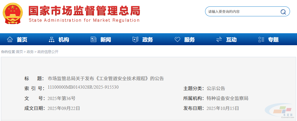 近日,国家市场监管总局关于发布《工业管道安全技术规程》的公告。(具体详见附件)
