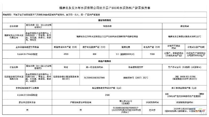 10月30日,福建省工业和信息化厅发布关于福建省永安万年水泥有限公司补充日产800吨水泥熟料产能置换方案的公告。
