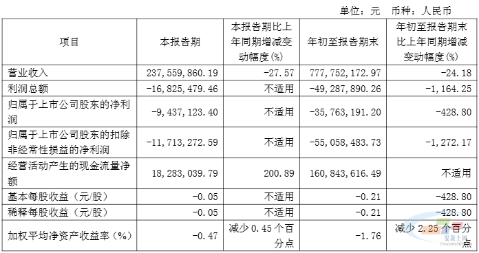 报告内容显示,公司前三季度实现营收7.78亿元,较上年同期下降24.18%;归母净利润亏损4928.79万元,较上年同期下降1164.25%。