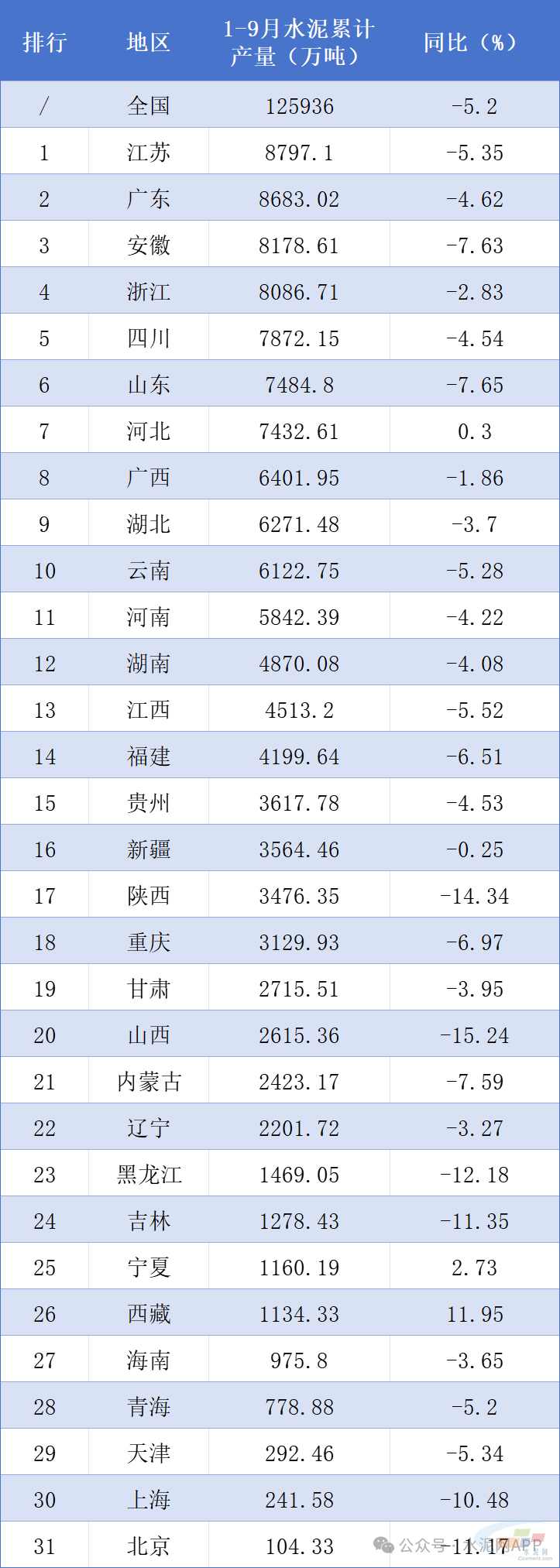 国家统计局数据显示,9月水泥产量为1.54亿吨,同比下降8.6%;1-9月水泥产量为12.59亿吨,同比下降5.2%。