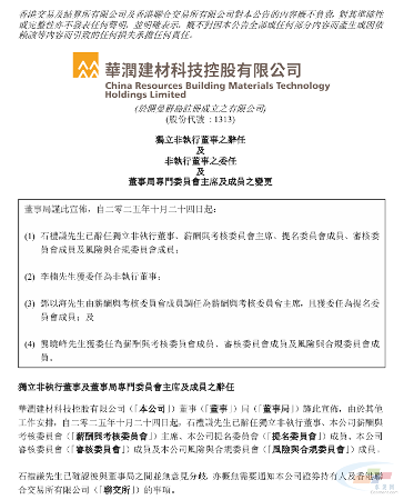 10月24日,华润建材科技控股有限公司发布关于“独立非执行董事之辞任及非执行董事之委任及董事局专门委员会主席及成员之变更”的公告。