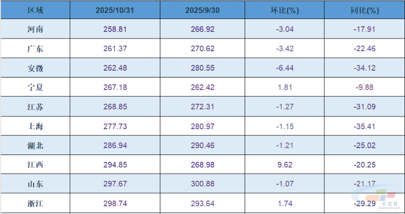 2025年10月全国P.O42.5散装水泥均价最低十省(元/吨)