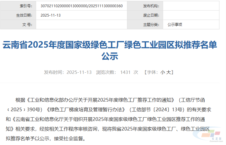 近日,云南省工业和信息化厅发布关于云南省2025年度国家级绿色工厂绿色工业园区拟推荐名单的公示,公示期自2025年11月13日起至2025年11月19日止,共5个工作日。