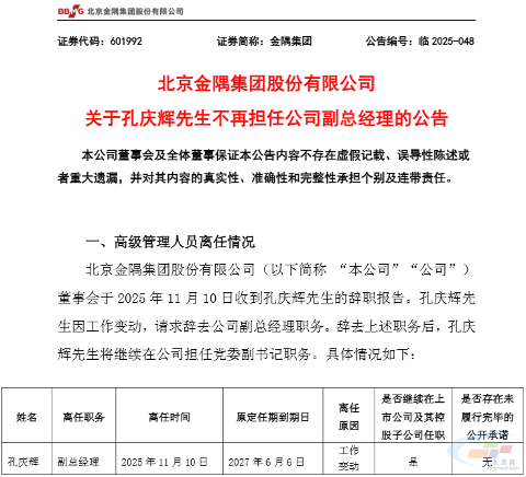 11月10日,金隅集团发布关于孔庆辉先生不再担任公司副总经理的公告。