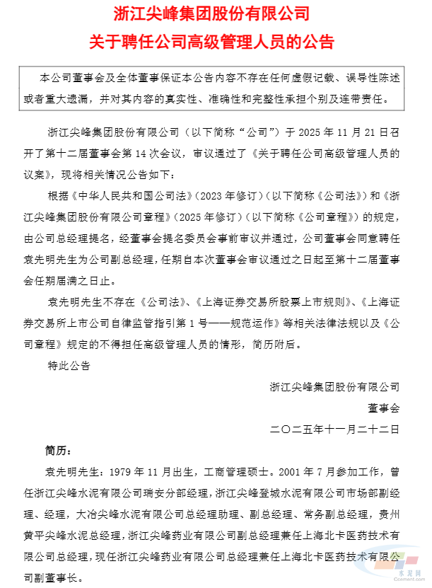 11月22日,尖峰集团发布公告,由公司总经理提名,径董事会提名委员会事前审议并通过,公司董事会同意聘任袁先明为公司副总经理。