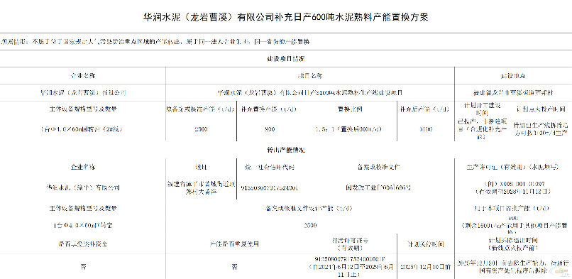 华润水泥(龙岩曹溪)有限公司2500t/d熟料线将按照1.5:1的比例补充600t/d产能,补充后产能为3100t/d;产能指标来自华润水泥(漳平)有限公司2500t/d熟料线中的900t/d产能。