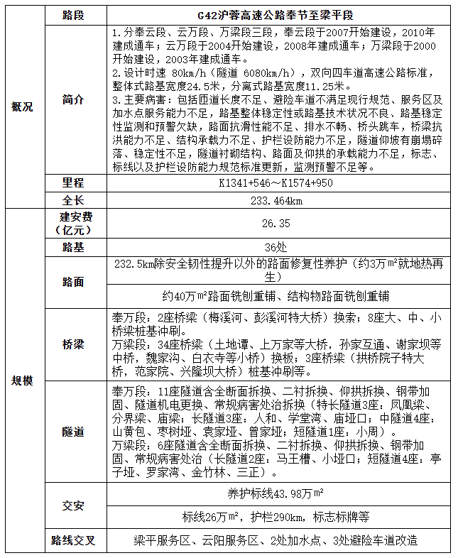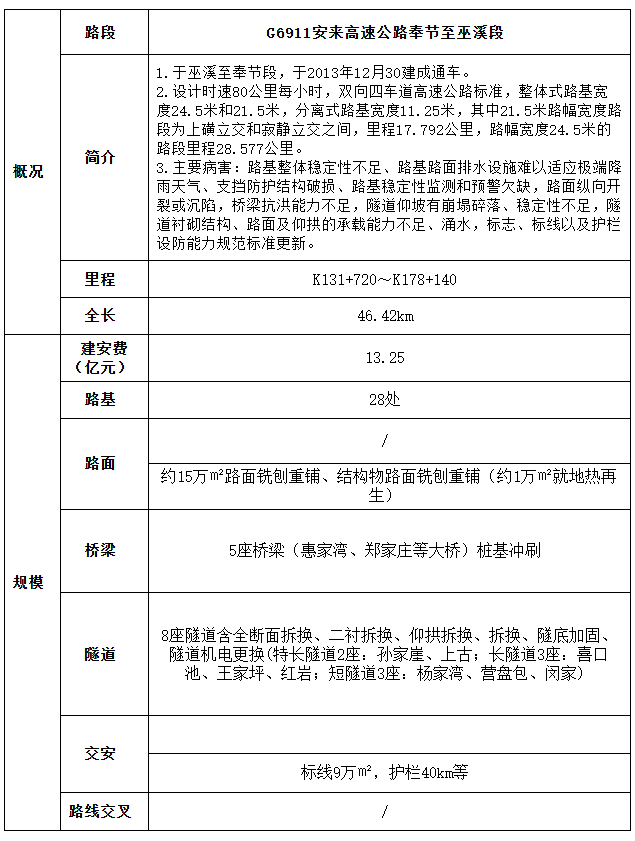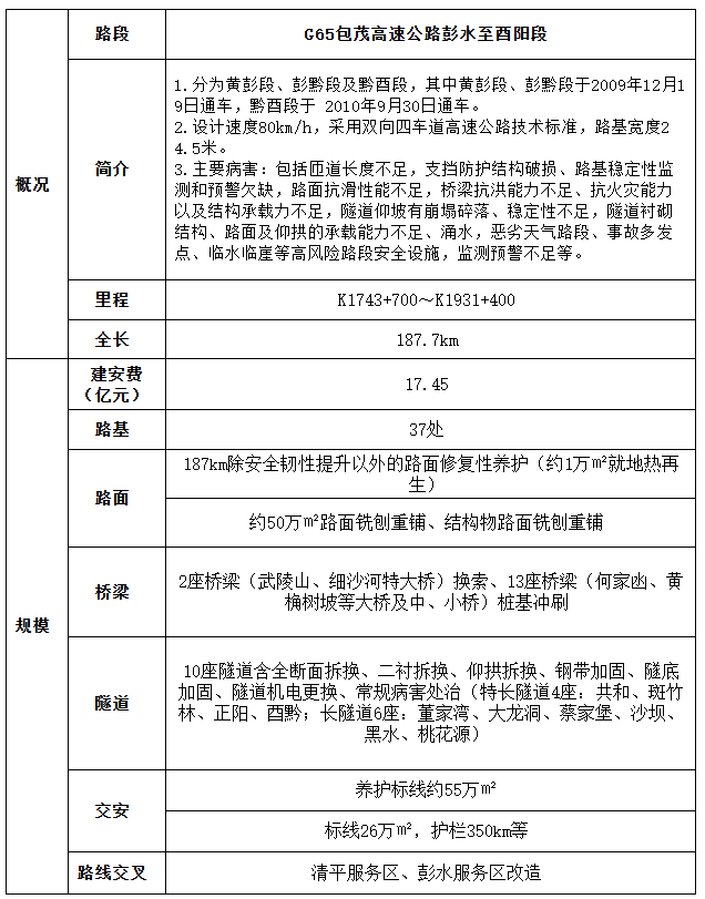 建设规模:G65包茂高速彭水至酉阳段(187.7 km)分为黄彭段、彭黔段及黔酉段;其中黄彭段、彭黔段于2009年建成通车,黔酉段于2010年建成通车。G6911安来高速巫溪至奉节段(46.4km),于2013年建成通车。G42沪蓉高速梁平至奉节段(232.35km)分为奉云段、云万段及万梁段;其中奉云段于2010年建成通车,云万段2008年建成通车,万梁段于2003年建成通车。项目在降低高速公路通行影响下,与路段范围内的专项养护合并实施,采用节能、绿色、低碳等先进工艺进行项目安全韧性提升建设及养护专项工程同步实施。