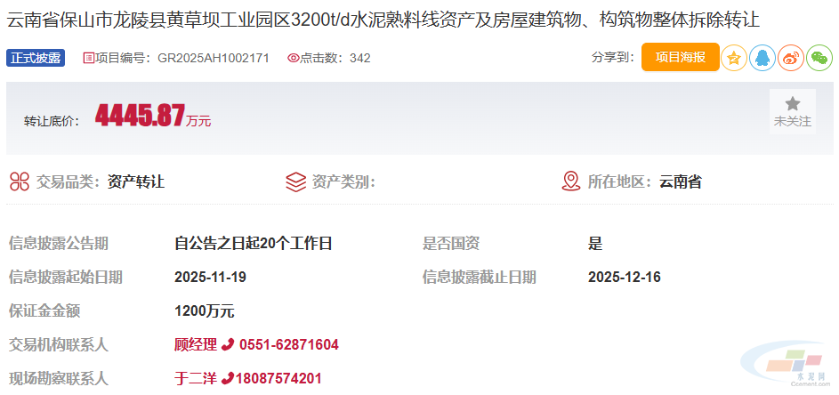 11月19日,据相关产权交易平台信息显示,云南省保山市龙陵县黄草坝工业园区3200t/d水泥熟料线资产及房屋建筑物、构筑物整体拆除转让,转让底价为4445.87万元,保证金金额为1200万元。