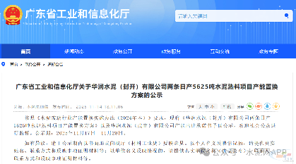 11月14日,广东省工信厅发布“关于华润水泥(封开)有限公司两条日产5625吨水泥熟料项目产能置换方案的公示”。