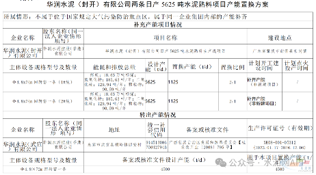 置换方案显示,华润水泥(武宣)公司退出一条4500t/d熟料生产线,产能用于补充华润水泥(封开)公司两条4500t/d熟料线,每条线补充产能1125t/d,补充后两条生产线产能均为5625t/d,置换比例2:1。