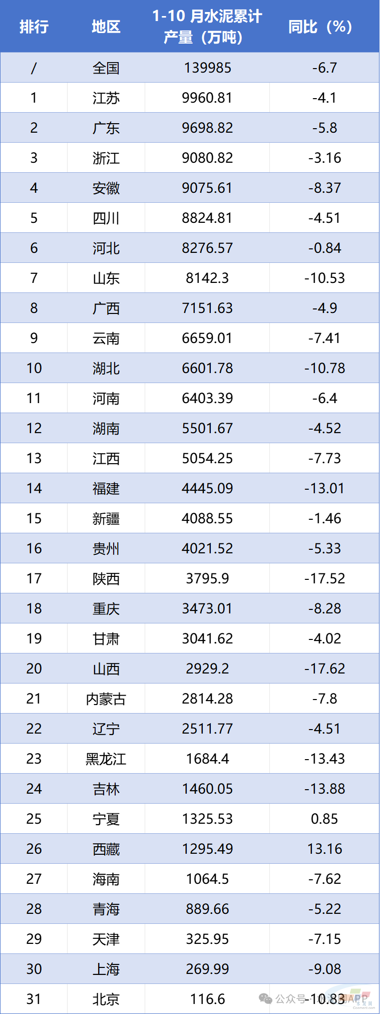 1-10月各地区水泥产量排名!