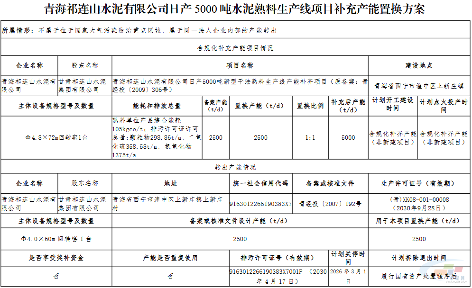 公告内容显示,青海祁连山水泥有限公司拟将2500t/d水泥熟料线产能补充至同公司另一条原产能为2500t/d的水泥熟料线,置换比例1:1,补充后产能为5000t/d。