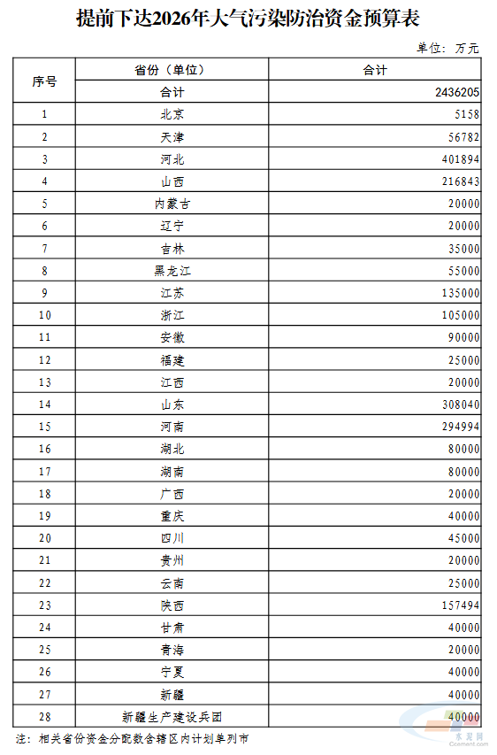 近日,财政部发布关于提前下达2026年大气污染防治资金预算的通知,本轮大气污染防治资金约为243.62亿元。