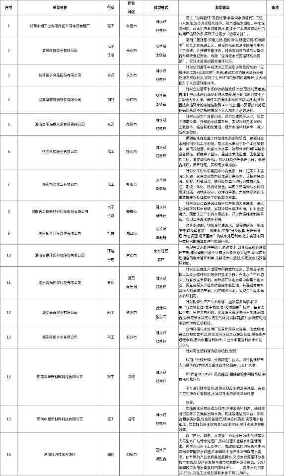 根据湖南省工业和信息化厅《关于开展工业废水循环利用典型案例征集工作的通知》要求,经企业和园区申报、市州工业和信息化部门推荐、专家综合评审等环节,确定了2025年湖南省工业废水循环利用典型案例名单,现予以公布。