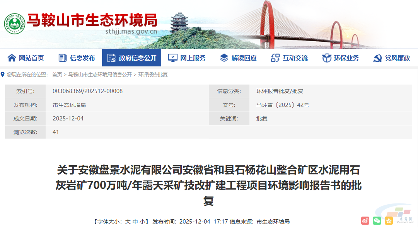 12月4日,安徽马鞍山市生态环境局发布关于安徽盘景水泥有限公司安徽省和县石杨花山整合矿区水泥用石灰岩矿700万吨/年露天采矿技改扩建工程项目环评获得批复的公示。