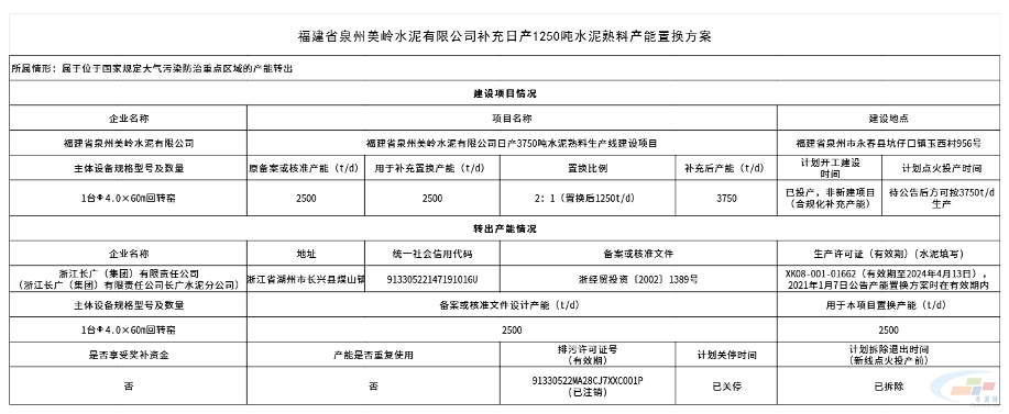 方案显示,浙江长广(集团)有限责任公司长广水泥分公司出让2500t/d产能至福建省泉州美岭水泥有限公司,用于补充2500t/d产能至3750t/d,置换比例2∶1。