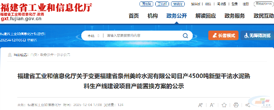 12月4日,福建省工业和信息化厅发布关于变更福建省泉州美岭水泥有限公司日产4500吨新型干法水泥熟料生产线建设项目产能置换方案的公示。
