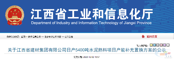 12月2日,江西省工业和信息化厅发布关于江西省建材集团有限公司日产5400吨水泥熟料项目产能补充置换方案的公示,公示时间为2025年12月2日至2025年12月15日。