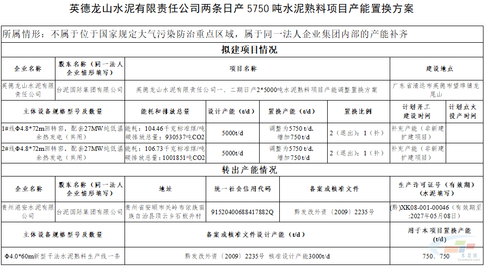 英德龙山水泥有限责任公司两条日产5750吨水泥熟料项目产能置换方案的通告