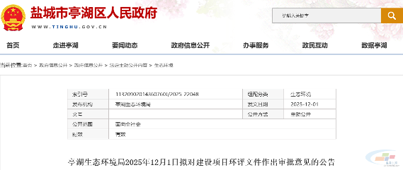 12月1日,江苏省盐城市亭湖区生态环境局发布关于拟对中铁二十四局集团江苏工程有限公司年产100万立方米混凝土项目环评文件作出审批意见的公告,公告期为2025年12月1日-2025年12月5日(五个工作日)。