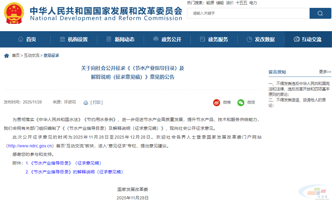 为贯彻落实《中华人民共和国水法》《节约用水条例》,进一步促进节水产业高质量发展,提升节水产品、技术和服务供给能力,近日,中国国家发展和改革委员会发布关于向社会公开征求《〈节水产业指导目录〉及解释说明(征求意见稿)》意见的公告,此次公开征求意见的时间为2025年11月28日至2025年12月28日。