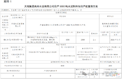 置换方案显示,天瑞集团禹州水泥退出一条5000t/d熟料生产线,其中2600t/d熟料产能用于天瑞集团禹州水泥浅井分公司4500t/d熟料生产线,补充后产能5800t/d;