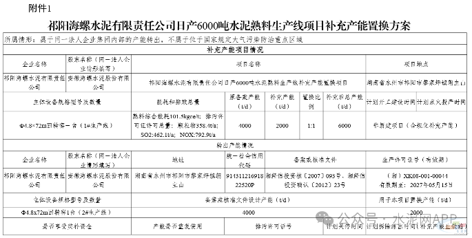 置换方案显示,祁阳海螺水泥退出1条4000t/d熟料生产线,其中2000t/d产能用于补充同厂区另一条4000t/d熟料线,补充后产能为6000t/d,置换比例1:1。