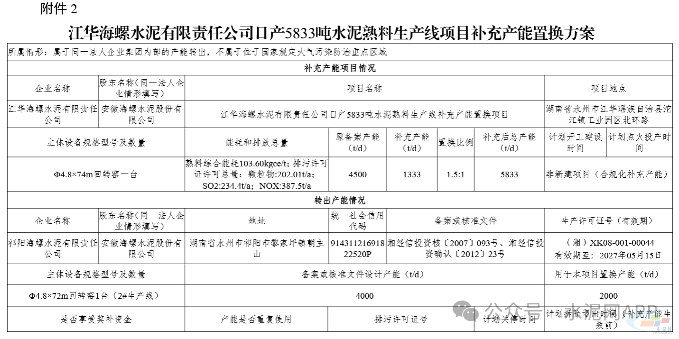 另外2000t/d产能用于补充江华海螺水泥一条4500t/d熟料生产线,补充后产能为5833t/d,置换比例1.5:1。