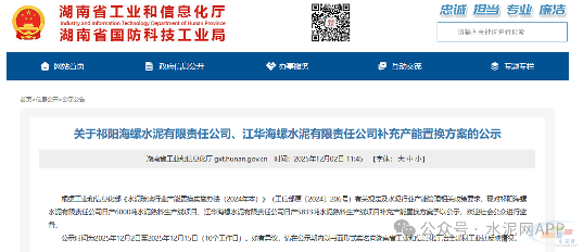 12月2日,湖南省工信厅发布“关于祁阳海螺水泥有限责任公司、江华海螺水泥有限责任公司补充产能置换方案的公示”。