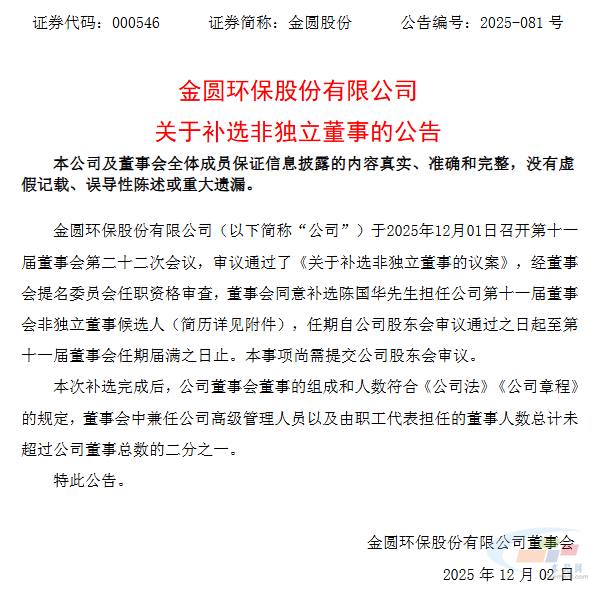 公告内容显示,金圆环保股份有限公司(以下简称“公司”)于2025年12月01日召开第十一届董事会第二十二次会议,审议通过了《关于补选非独立董事的议案》,经董事会提名委员会任职资格审查,董事会同意补选陈国华先生担任公司第十一届董事会非独立董事候选人(附简历),任期自公司股东会审议通过之日起至第十一届董事会任期届满之日止。