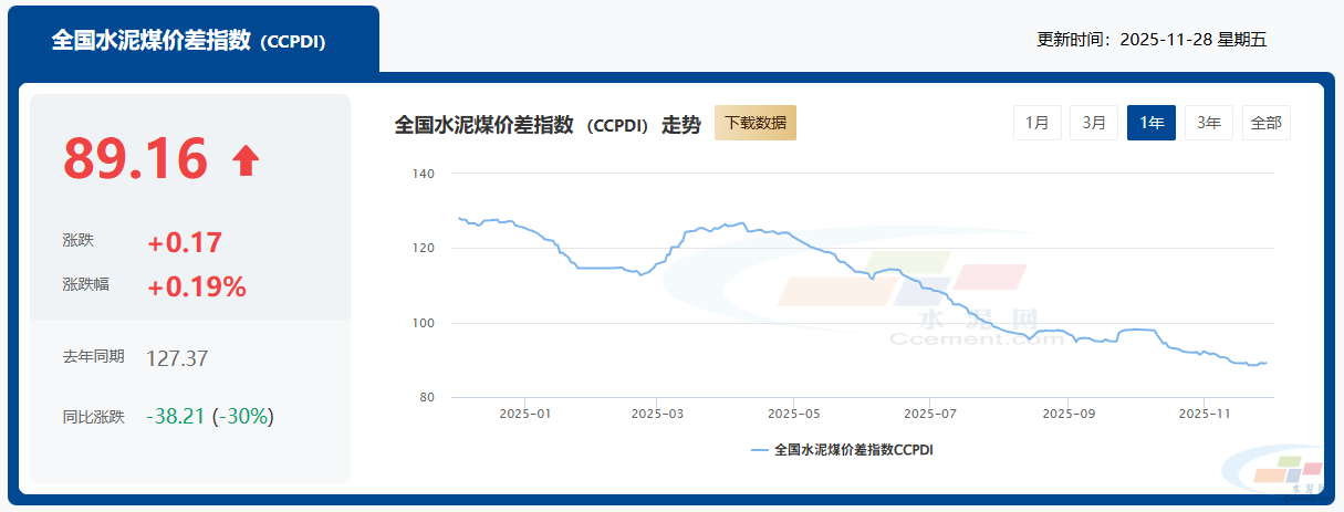 另外,作为反映P.O42.5散装水泥到位价扣除吨煤炭成本后的变动情况的核心指数,同时也是反应水泥行业盈利空间大小的关键指标,中国水泥煤价差指数(CCPDI)自今年4月初以来,呈现持续下滑态势,截止到11月底,下跌37.58点。