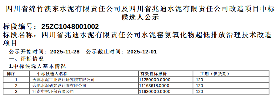 11月28日,四川省兆迪水泥有限责任公司水泥窑氮氧化物超低排放治理技术改造项目中标候选人公示。