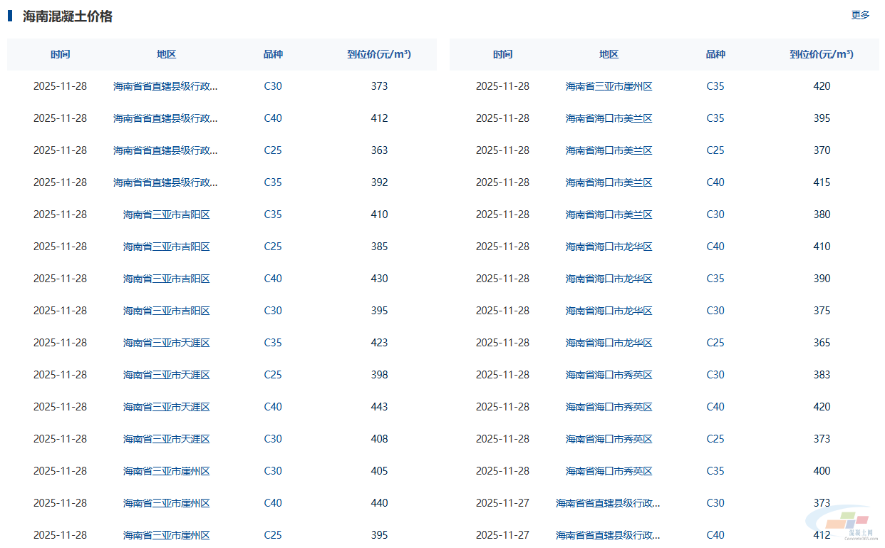 海南省内C30混凝土的市场价格区间在375-410元/方之间,显示出一定的地区差异。