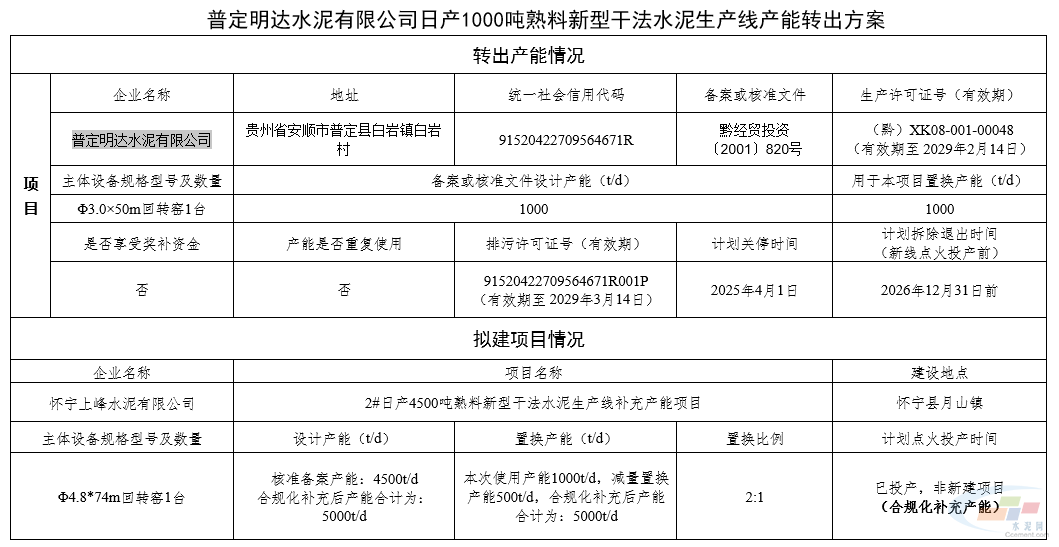 11月25日,贵州省工信厅发布《关于普定明达水泥有限公司日产1000吨熟料新型干法水泥生产线产能转出方案的公告》。