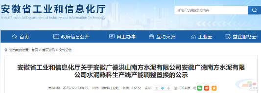 12月15日,安徽省工信厅发布关于“安徽广德洪山南方水泥有限公司安徽广德南方水泥有限公司水泥熟料生产线产能调整置换的公示”。
