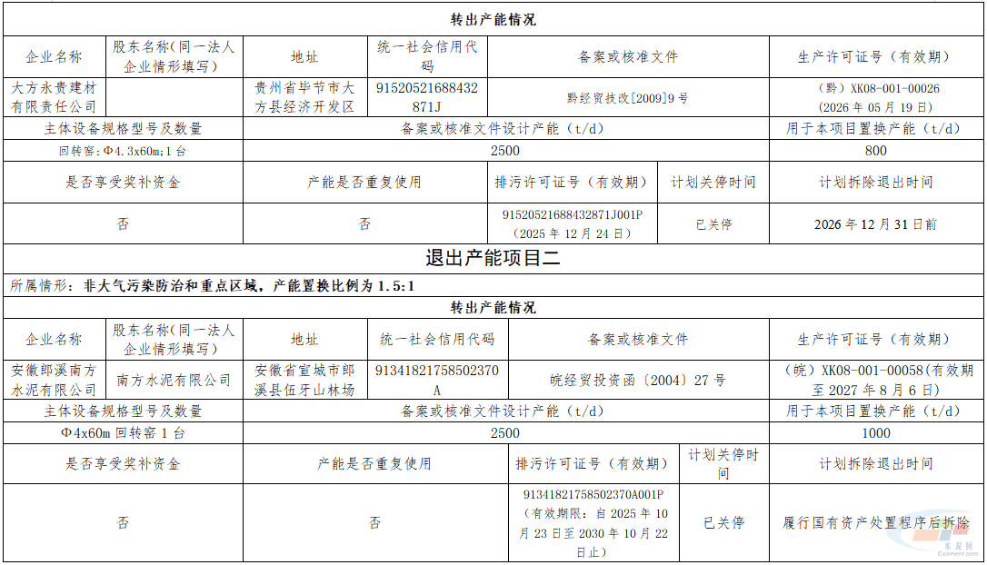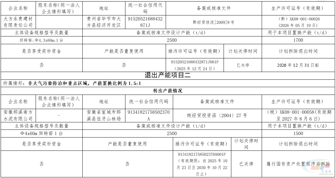 产能置换方案实施后,大方永贵建材有限责任公司1条2500t/d水泥熟料生产线计划于2026年12月31日前拆除退出,安徽郎溪南方水泥有限公司1条2500t/d水泥熟料生产线计划履行国有资产处置程序后拆除退出。