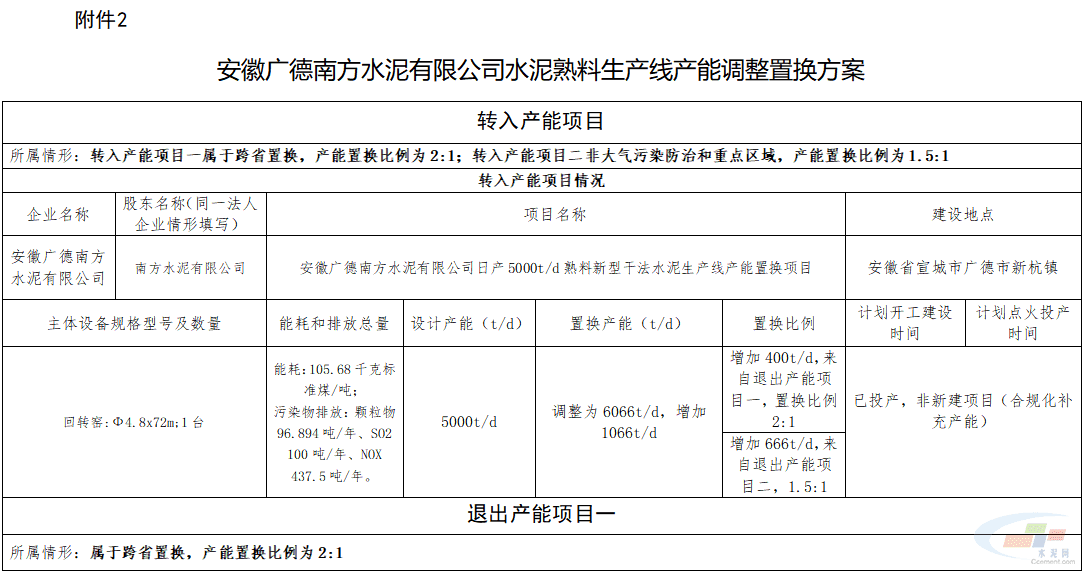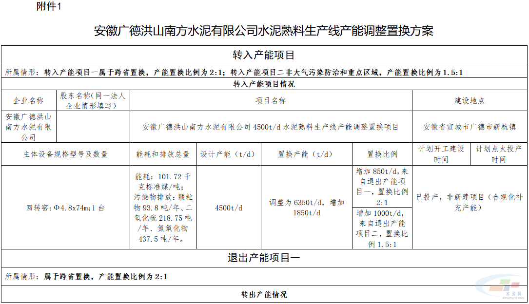 安徽广德洪山南方水泥有限公司和安徽广德南方水泥有限公司拟将4500t/d和5000t/d水泥熟料生产线通过补产能方式将产能分别增加到6350t/d和6066t/d,置换产能来自大方永贵建材有限责任公司和安徽郎溪南方水泥有限公司,置换比例分别为2:1和1.5:1。