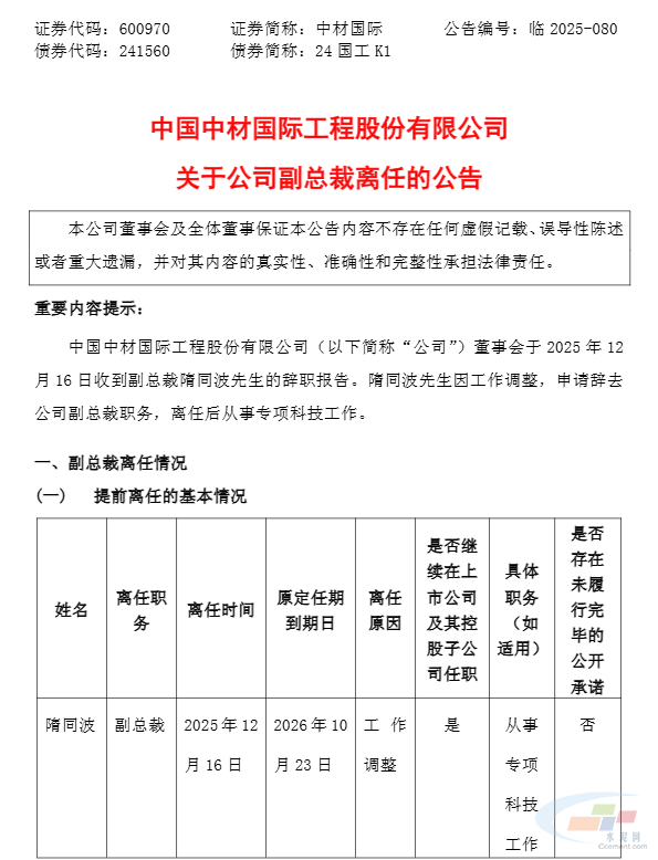 行业视野 中材国际副总裁辞职! 金峰建材 2026-04-26 2026-04-26 12月16日晚,中材国际发布关于公司副总裁离任的公告。 中材国际表示,董事会于2025年12月16日收到副总裁隋同波的辞职报告,隋同波因工作调整,申请辞去公司副总裁职务,离任后从事专项科技工作。 分享本文: 本文链接:https://860854.dajhao1.top/hangyeshiye/4309.html
