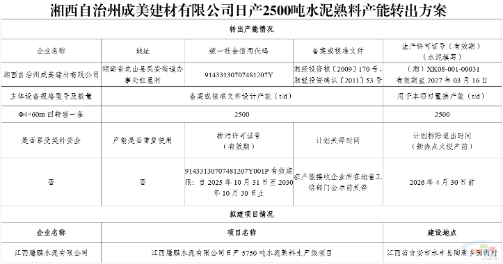 湖南:关于湘西自治州成美建材有限公司日产2500吨水泥熟料产能转出方案的公示