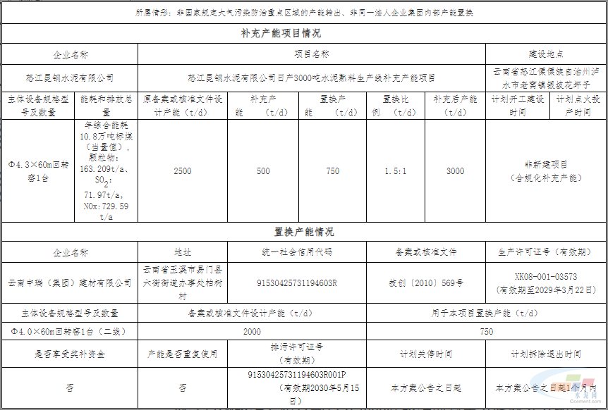 云南中瑞(集团)建材有限公司一条2000t/d水泥熟料线中的750t/d用于该项目置换产能,计划在本方案公告之日起1个月内拆除退出。